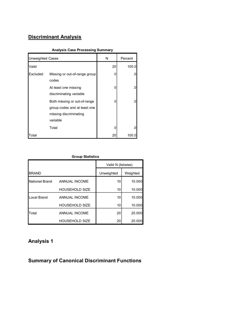 Analysis Case Processing Summary Unweighted Cases Valid Excluded Missing or out-of-range group codes At least one missing discriminating variable Both missing or out-of-range group codes and at least one missing discriminating variable Total Total 0 20 .0 100.0 0 .0 0 .0 N 20 0 Percent 100.0 .0