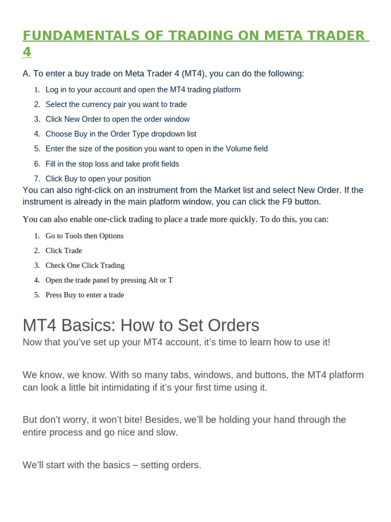 A. To enter a buy trade on Meta Trader 4 (MT4), you can do the following: