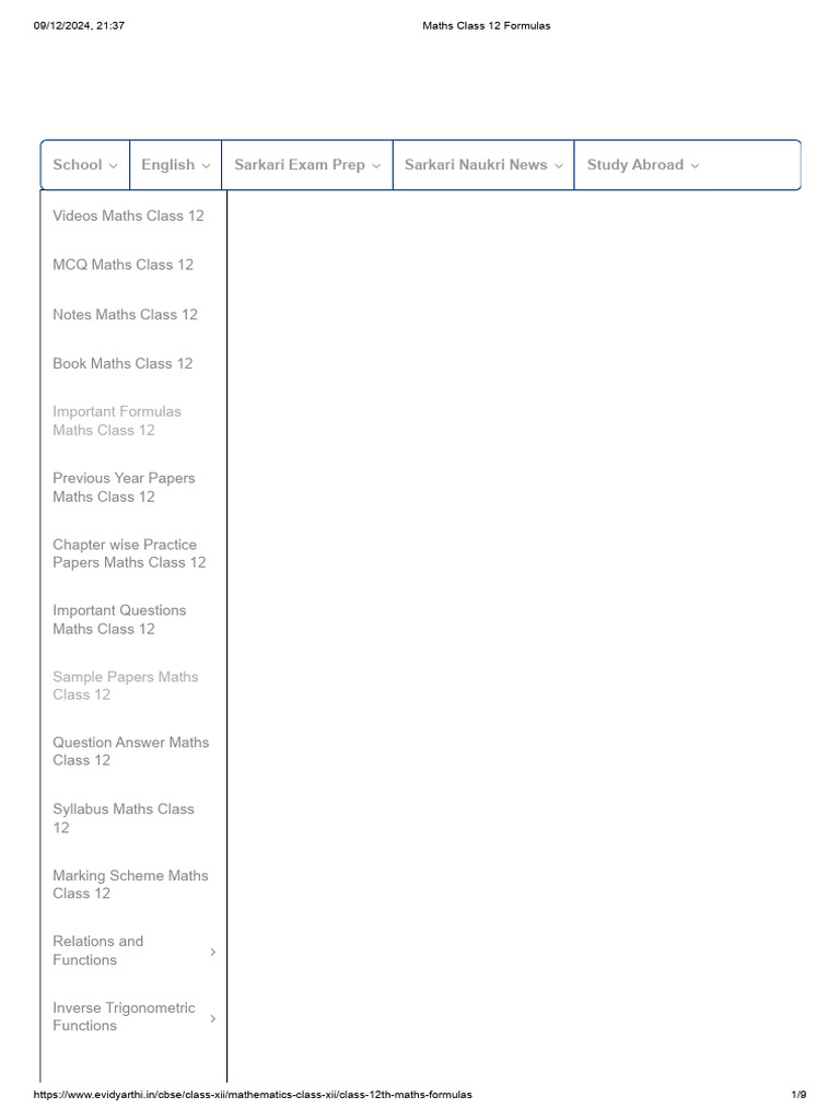 https://www.evidyarthi.in/cbse/class-xii/mathematics-class-xii/class-12th-maths-formulas 1/9