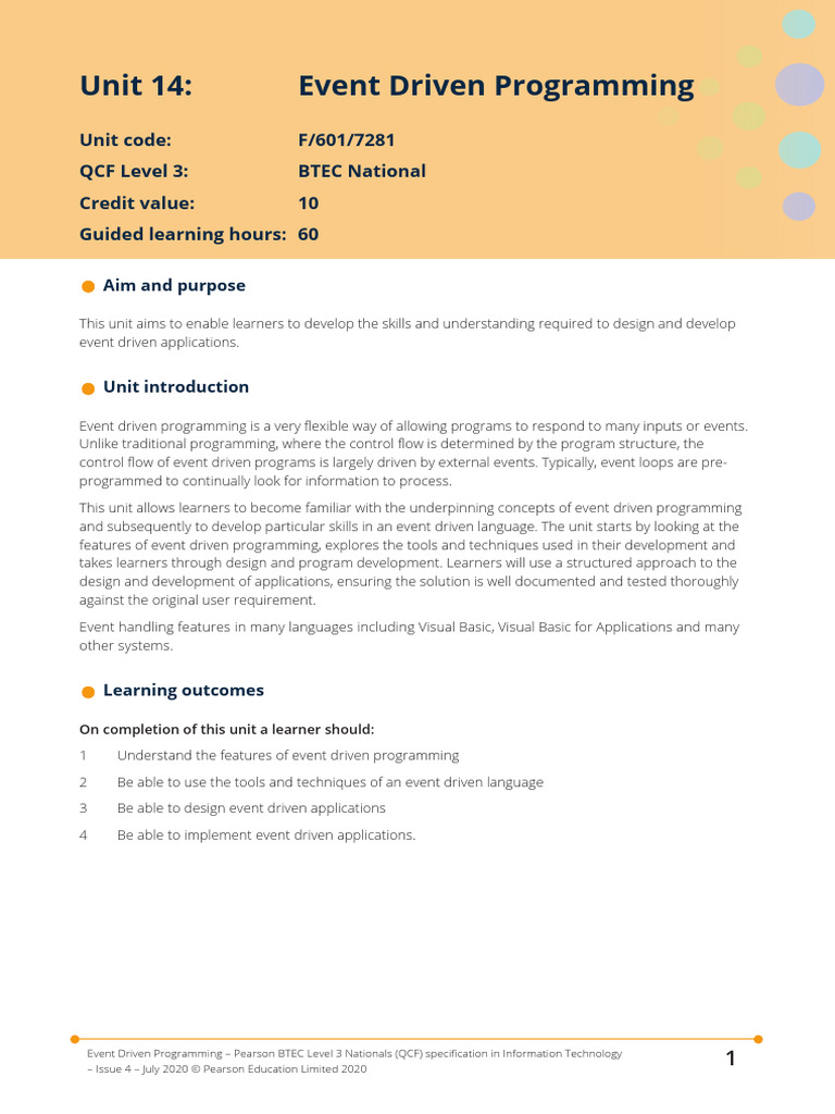 Event Driven Programming – Pearson BTEC Level 3 Nationals (QCF) specification in Information Technology