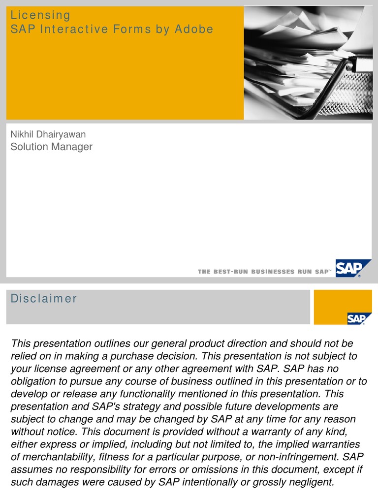 This presentation outlines our general product direction and should not be relied on in making a purchase decision. This presentation is not subject to your license agreement or any other agreement with SAP. SAP has no obligation to pursue any course of business outlined in this presentation or to develop or release any functionality mentioned in this presentation. This presentation and SAP's strategy and possible future developments are subject to change and may be changed by SAP at any time for any reason without notice. This document is provided without a warranty of any kind, either express or implied, including but not limited to, the implied warranties of merchantability, fitness for a particular purpose, or non-infringement. SAP assumes no responsibility for errors or omissions in this document, except if such damages were caused by SAP intentionally or grossly negligent.