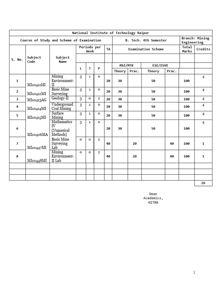 Mining Engineering 3-1-0, (4) Core MI10411MI