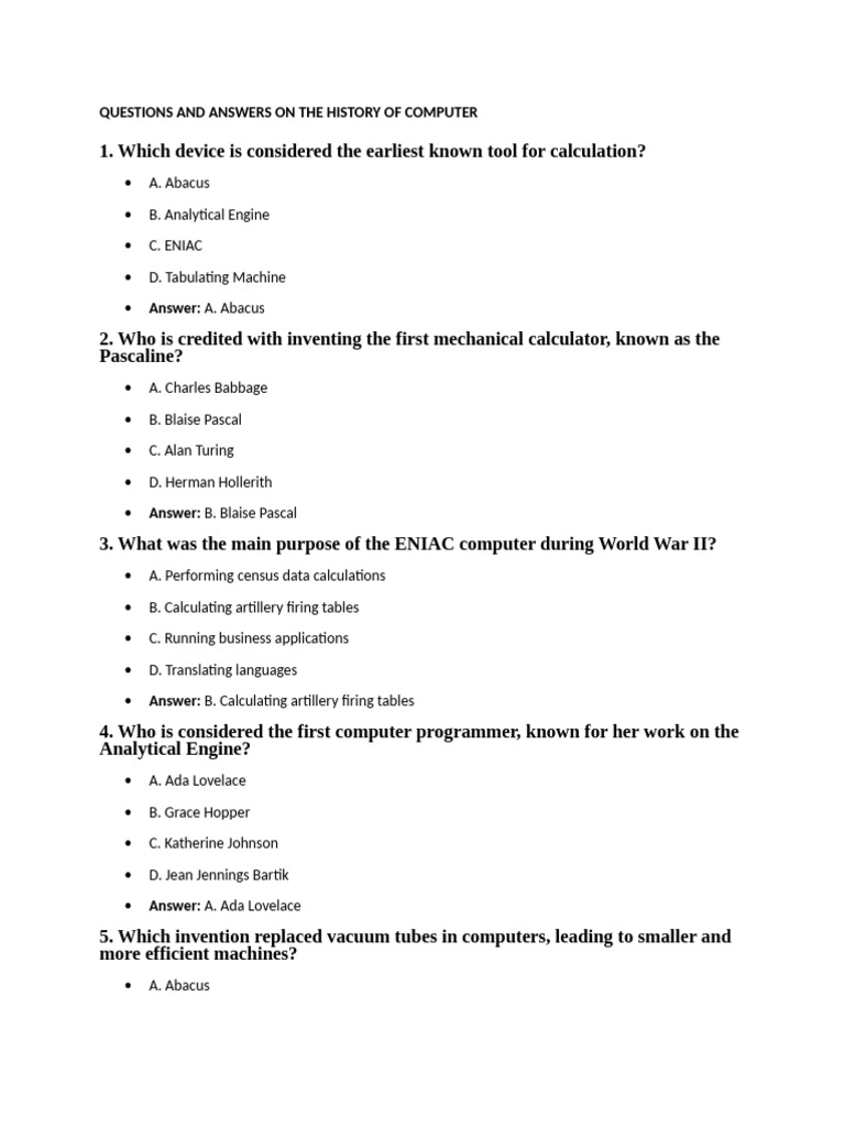 QUESTIONS AND ANSWERS ON THE HISTORY OF COMPUTER