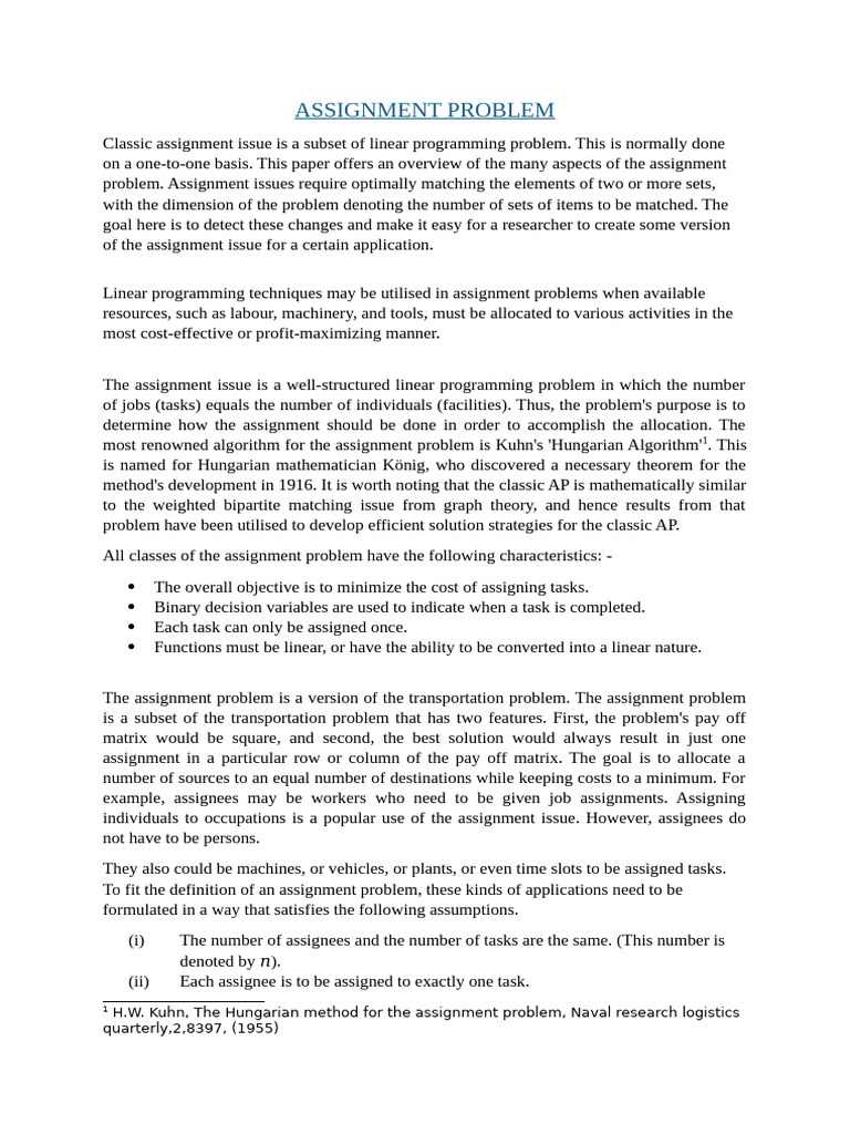 problem. Assignment issues require optimally matching the elements of two or more sets,
