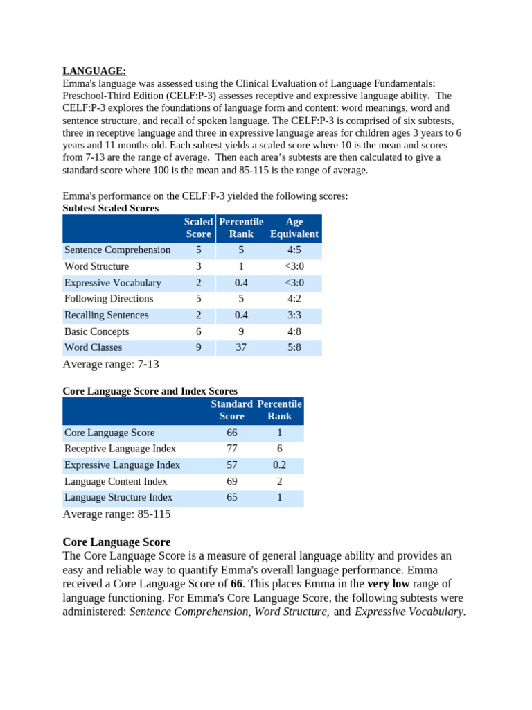 Emma's language was assessed using the Clinical Evaluation of Language Fundamentals: