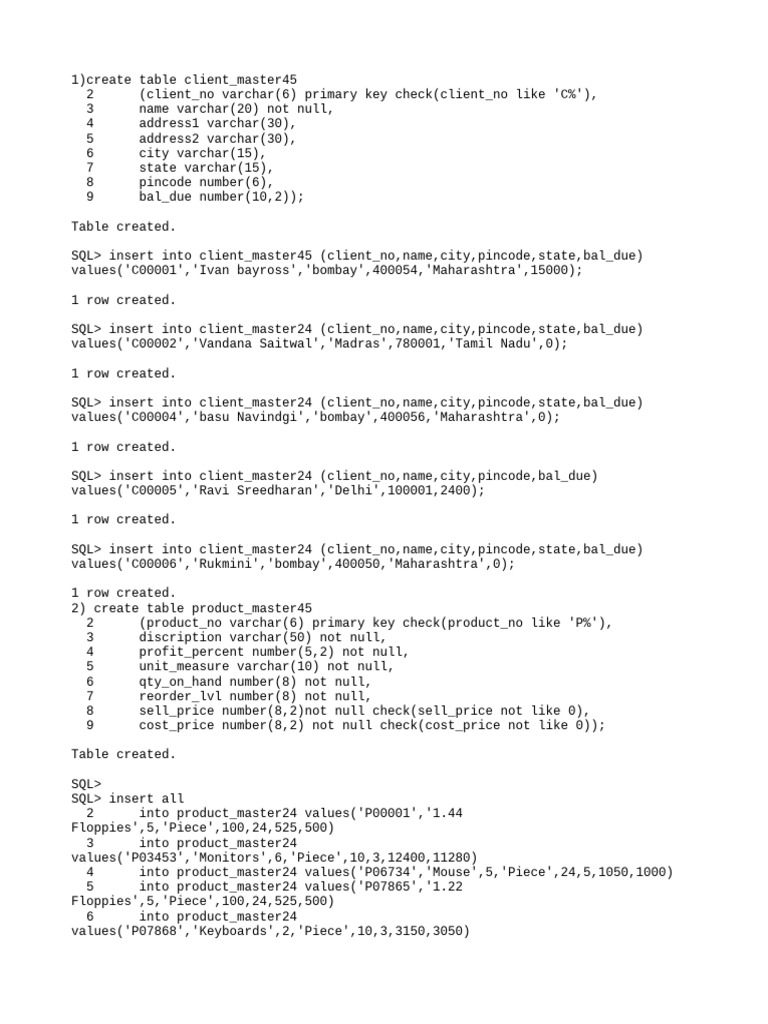 SQL> insert into client_master45 (client_no,name,city,pincode,state,bal_due)