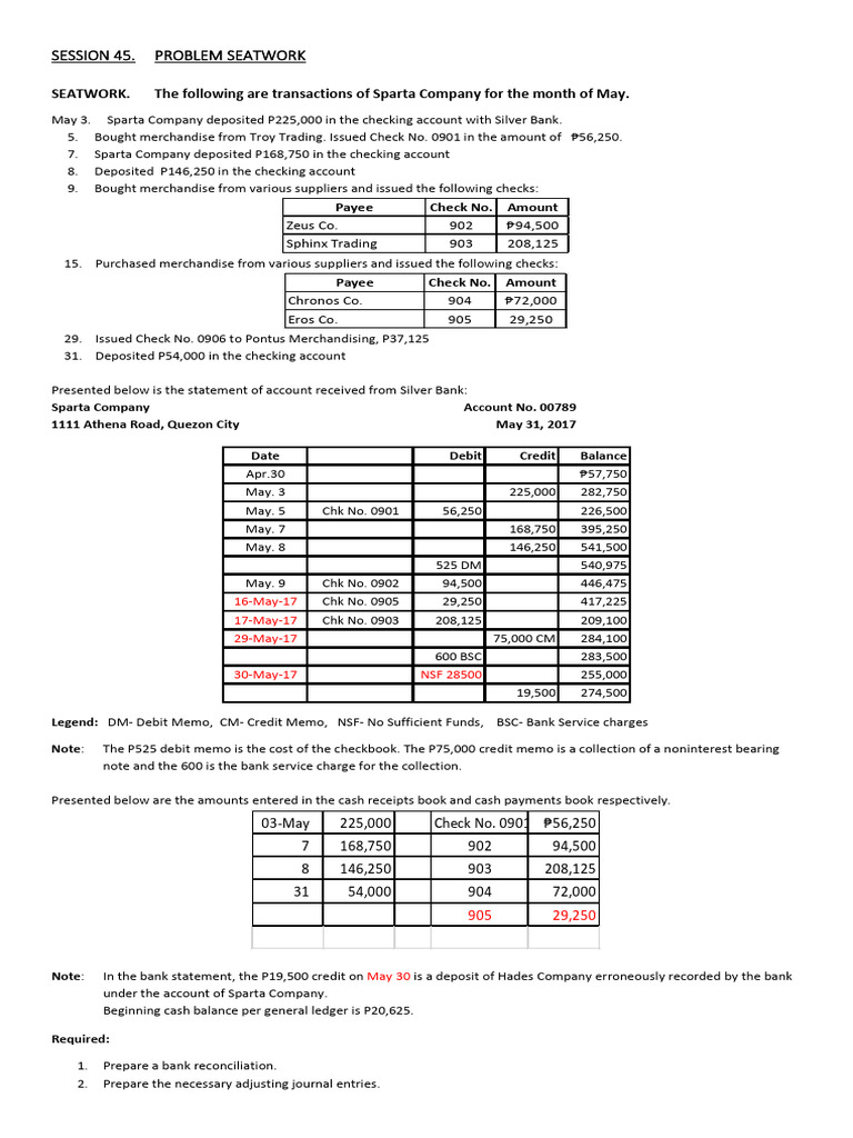 SEATWORK. The following are transactions of Sparta Company for the month of May.