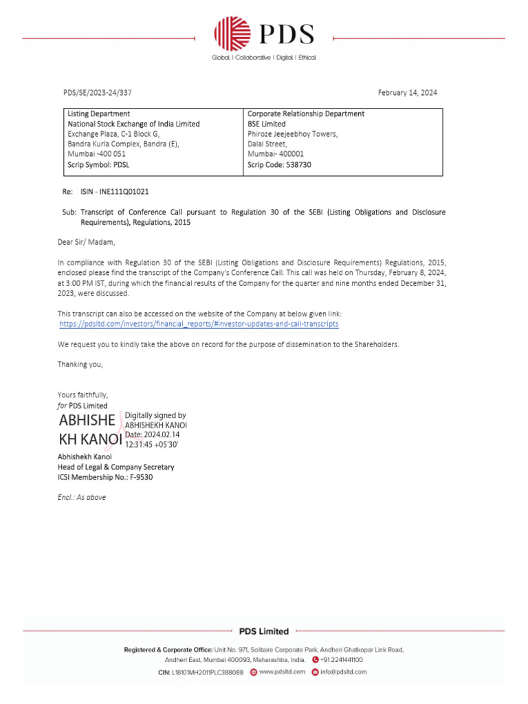 “PDS Limited Q3 FY’24 Earnings Conference Call”