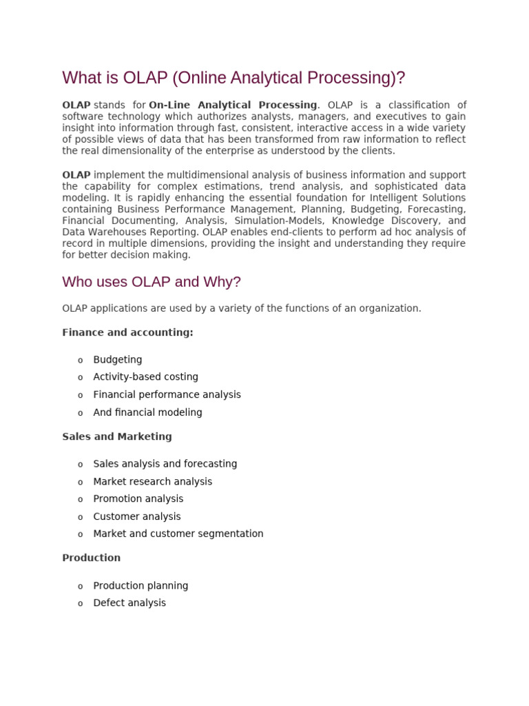 Fundamentally, OLAP has a very simple concept. It pre-calculates most of the