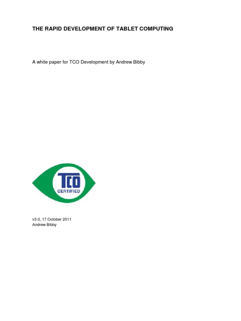 The future will be crawling with tablets. The success of Apples iPad has convinced the world that a slim rectangle with a touch screen is tomorrows computer. So began an article in the Financial Times daily Lex column in September 2011 1. The article went on to note the five-fold increase in the number of tablets sold worldwide between the second quarter of 2010 and the equivalent quarter of 2011. The IT world is all too familiar with hype. Each time a new product or operating system is launched, industry pundits and media commentators reach in their dictionaries for the hyperboles. This is the big one, or so the story goes and then, too often, todays launch turns into tomorrows forgotten product. With tablets, though, there is reason to believe that the industry and media excitement may not be entirely out of place. In the very short period since Apple launched its first iPad in early 2010, the numbers of tablets shipped and sold has grown astonishingly fast. For Apple itself, the iPad has been its fastest-selling product ever. The speed at which tablet computing has taken off brings the risk, though, that some IT brands may rush to bring products to market, in the process skimping on quality and on other key product criteria. The challenge both for those professionals responsible for procuring IT equipment and for end users is to know how to identify those tablets which do meet high standards. The decision by TCO Development to extend its international certification programme to tablets is, therefore, a timely one. This white paper, commissioned from the independent journalist and writer Andrew Bibby, is being published to coincide with the launch of the TCO Certified Tablets programme. The report offers a short examination of the background to the rapid growth of interest in tablet computing, and assesses the wider implications of a technological tool which could change profoundly the future shape of both business and consumer computer usage.