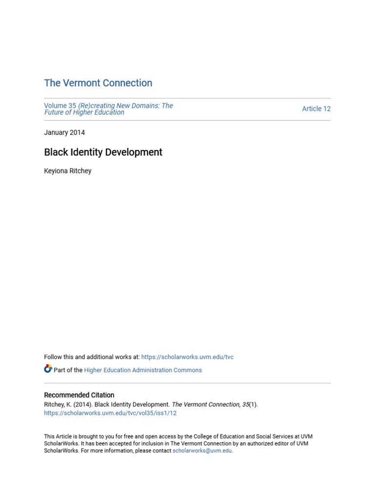 Ritchey, K. (2014). Black Identity Development. The Vermont Connection, 35(1).