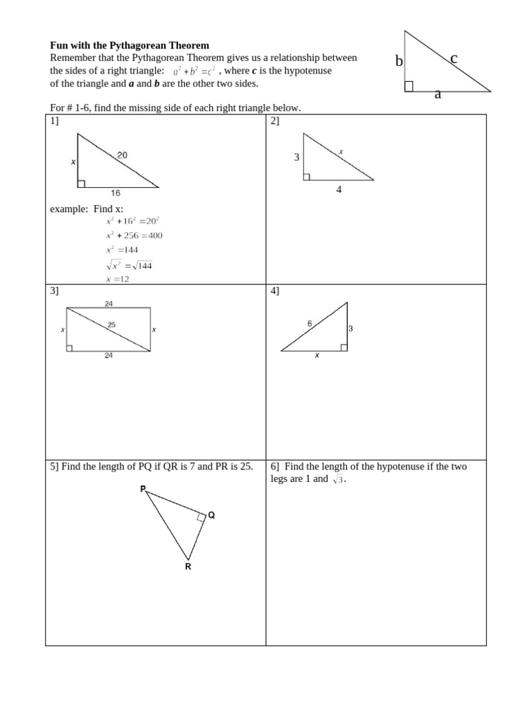 On the other side of this worksheet, we used the Pythagorean Theorem to find a missing side of a right