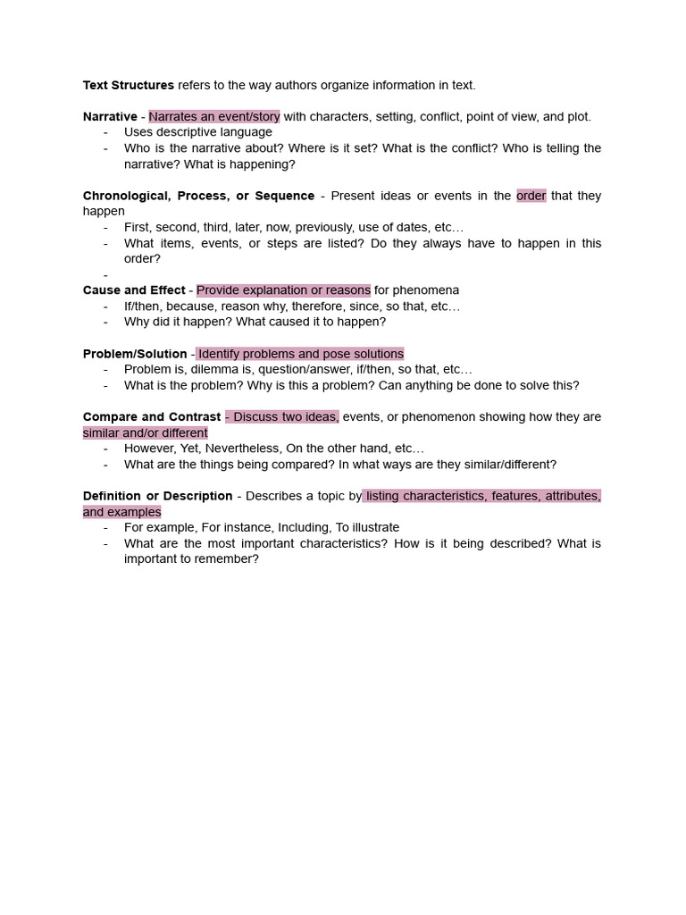Text Structures refers to the way authors organize information in text.