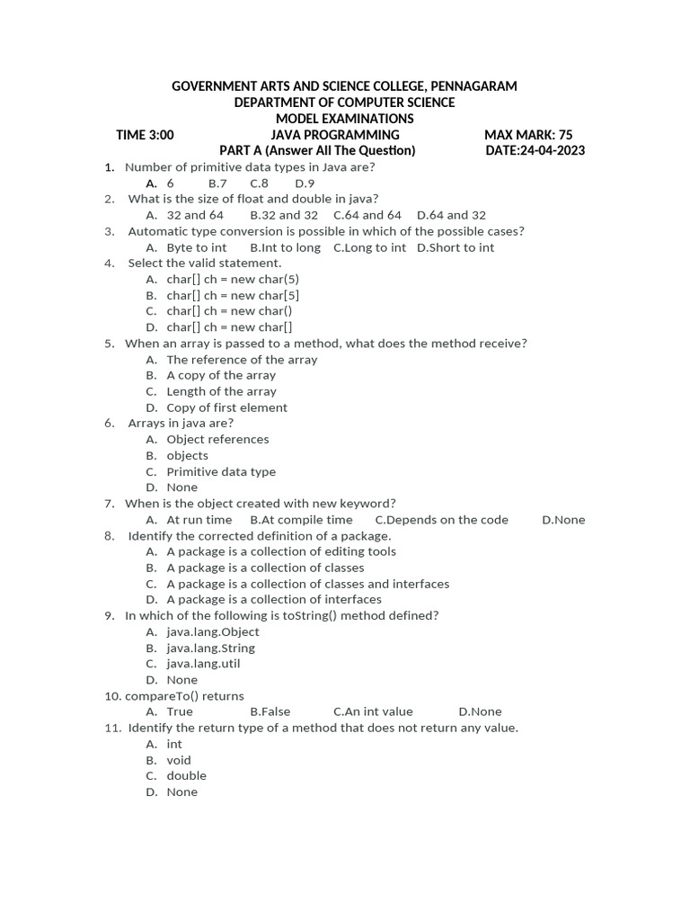 TIME 3:00 JAVA PROGRAMMING MAX MARK: 75