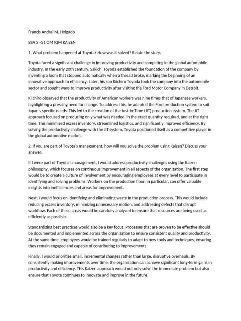 2. If you are part of Toyota's management, how will you solve the problem using Kaizen? Discuss your