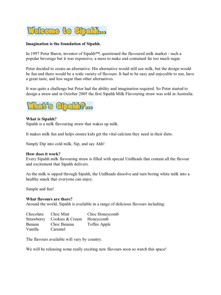 What is Sipahh? Sipahh is a milk flavouring straw that wakes up milk. It makes milk fun and helps ensure kids get the vital calcium they need in their diets. Simply Dip into cold milk, Sip, and say Ahh! How does it work? Every Sipahh milk flavouring straw is filled with special UniBeads that contain all the flavour and excitement that Sipahh delivers. As the milk is sipped through Sipahh, the UniBeads dissolve and turn boring white milk into a healthy snack that everyone can enjoy. Simple and fun! What flavours are there? Around the world, Sipahh is available in a range of delicious flavours including: Chocolate Strawberry Banana Vanilla Choc Mint Cookies & Cream Choc Banana Caramel Choc Honeycomb Honeycomb Toffee Apple