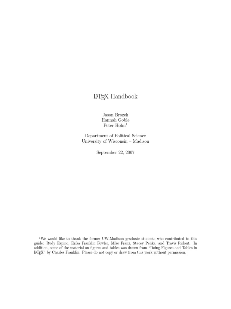 We would like to thank the former UW-Madison graduate students who contributed to this guide: Rudy Espino, Erika Franklin Fowler, Mike Franz, Stacey Pelika, and Travis Ridout. In addition, some of the material on gures and tables was drawn from Doing Figures and Tables in A L TEX by Charles Franklin. Please do not copy or draw from this work without permission.