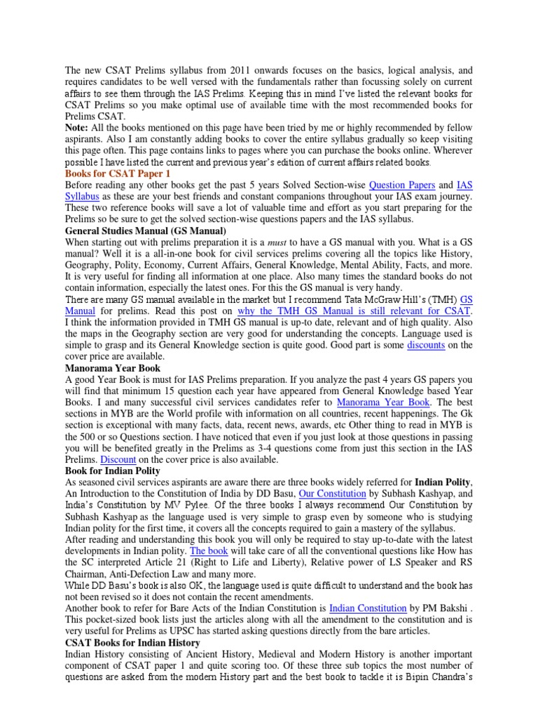 candidates to be well versed with the fundamentals rather than focussing solely on current affairs to see them through the IAS Prelims. Keeping this in mind Ive listed the relevant books for CSAT Prelims so you make optimal use of available time with the most recommended books for Prelims CSAT. Note: All the books mentioned on this page have been tried by me or highly recommended by fellow aspirants. Also I am constantly adding books to cover the entire syllabus gradually so keep visiting this page often. This page contains links to pages where you can purchase the books online. Wherever possible I have listed the current and previous years edition of current affairs related books. Books for CSAT Paper 1 Before reading any other books get the past 5 years Solved Section-wise Question Papers and IAS Syllabus as these are your best friends and constant companions throughout your IAS exam journey. These two reference books will save a lot of valuable time and effort as you start preparing for the Prelims so be sure to get the solved section-wise questions papers and the IAS syllabus. General Studies Manual (GS Manual) When starting out with prelims preparation it is a must to have a GS manual with you. What is a GS manual? Well it is a all-in-one book for civil services prelims covering all the topics like History, Geography, Polity, Economy, Current Affairs, General Knowledge, Mental Ability, Facts, and more. It is very useful for finding all information at one place. Also many times the standard books do not contain information, especially the latest ones. For this the GS manual is very handy. There are many GS manual available in the market but I recommend Tata McGraw Hills (TMH) GS Manual for prelims. Read this post on why the TMH GS Manual is still relevant for CSAT. I think the information provided in TMH GS manual is up-to date, relevant and of high quality. Also the maps in the Geography section are very good for understanding the concepts. Language used is simple to grasp and its General Knowledge section is quite good. Good part is some discounts on the cover price are available. Manorama Year Book A good Year Book is must for IAS Prelims preparation. If you analyze the past 4 years GS papers you will find that minimum 15 question each year have appeared from General Knowledge based Year Books. I and many successful civil services candidates refer to Manorama Year Book. The best sections in MYB are the World profile with information on all countries, recent happenings. The Gk section is exceptional with many facts, data, recent news, awards, etc Other thing to read in MYB is the 500 or so Questions section. I have noticed that even if you just look at those questions in passing you will be benefited greatly in the Prelims as 3-4 questions come from just this section in the IAS Prelims. Discount on the cover price is also available. Book for Indian Polity As seasoned civil services aspirants are aware there are three books widely referred for Indian Polity, An Introduction to the Constitution of India by DD Basu, Our Constitution by Subhash Kashyap, and Indias Constitution by MV Pylee. Of the three books I always recommend Our Constitution by Subhash Kashyap as the language used is very simple to grasp even by someone who is studying Indian polity for the first time, it covers all the concepts required to gain a mastery of the syllabus. After reading and understanding this book you will only be required to stay up-to-date with the latest developments in Indian polity. The book will take care of all the conventional questions like How has the SC interpreted Article 21 (Right to Life and Liberty), Relative power of LS Speaker and RS Chairman, Anti-Defection Law and many more. While DD Basus book is also OK, the language used is quite difficult to understand and the book has not been revised so it does not contain the recent amendments. Another book to refer for Bare Acts of the Indian Constitution is Indian Constitution by PM Bakshi . This pocket-sized book lists just the articles along with all the amendment to the constitution and is very useful for Prelims as UPSC has started asking questions directly from the bare articles. CSAT Books for Indian History Indian History consisting of Ancient History, Medieval and Modern History is another important component of CSAT paper 1 and quite scoring too. Of these three sub topics the most number of questions are asked from the modern History part and the best book to tackle it is Bipin Chandras