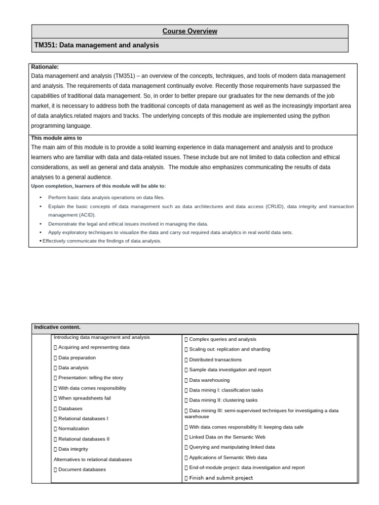 Data management and analysis (TM351) – an overview of the concepts, techniques, and tools of modern data management