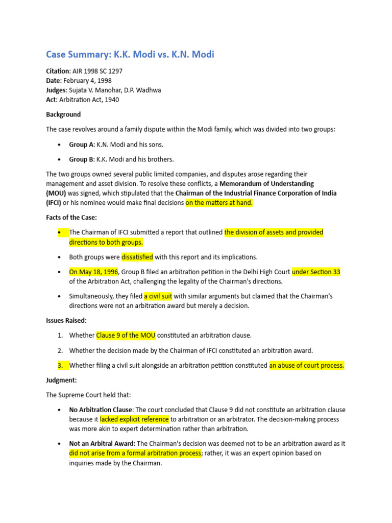 The K.K. Modi vs. K.N. Modi case is significant in clarifying aspects of arbitration agreements and awards