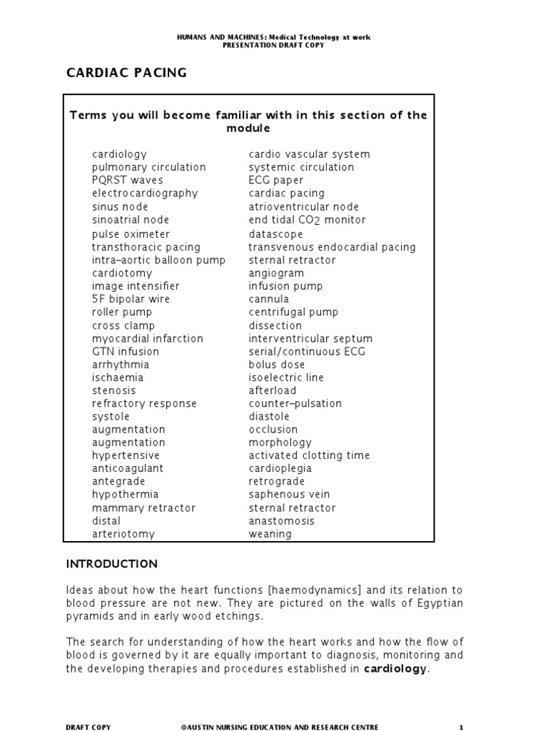 Terms you will become familiar with in this sec tion of the module cardiology pulmonary circulation PQRST waves electrocardiography sinus node sinoatrial node pulse oximeter transthoracic pacing intra-aortic balloon pump cardiotomy image intensifier 5F bipolar wire roller pump cross clamp myocardial infarction GTN infusion arrhythmia ischaemia stenosis refractory response systole augmentation augmentation hypertensive anticoagulant antegrade hypothermia mammary retractor distal arteriotomy INTRODUCTION Ideas about how the heart functions [haemodynamics] and its relation to blood pressure are not new. They are pictured on the walls of Egyptian pyramids and in early wood etchings. The search for understanding of how the heart works and how the flow of blood is governed by it are equally important to diagnosis, monitoring and the developing therapies and procedures established in cardiology. cardio vascular system systemic circulation ECG paper cardiac pacing atrioventricular node end tidal CO2 monitor datascope transvenous endocardial pacing sternal retractor angiogram infusion pump cannula centrifugal pump dissection interventricular septum serial/continuous ECG bolus dose isoelectric line afterload counter-pulsation diastole occlusion morphology activated clotting time cardioplegia retrograde saphenous vein sternal retractor anastomosis weaning