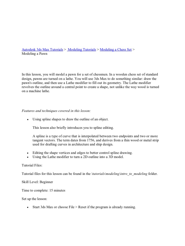In the Introduction to Materials and Mapping tutorials, you'll provide the chess pieces with moreconvincing color and texture and create a shiny, reflective wood-grain chessboard. Summary In this lesson you learned spline creation and editing. You also learned to create 3D geometry using the Lathe modifier. Next Modeling a Bishop Please send us your comment about this page