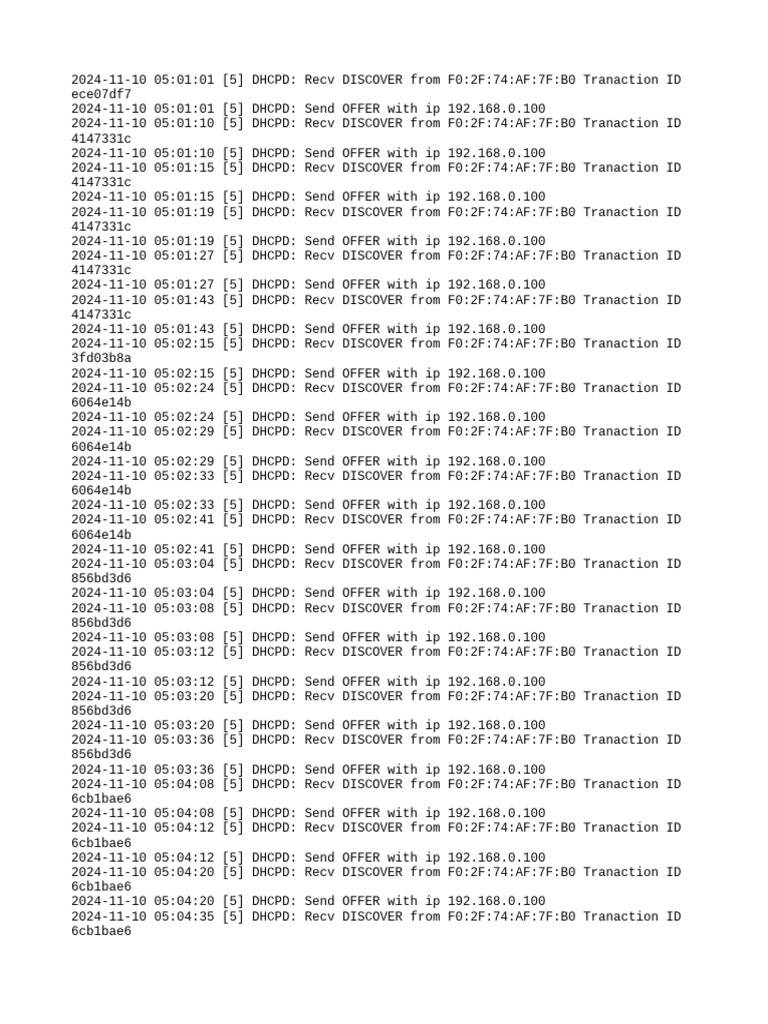 2024-11-10 05:03:04 [5] DHCPD: Recv DISCOVER from F0:2F:74:AF:7F:B0 Tranaction ID