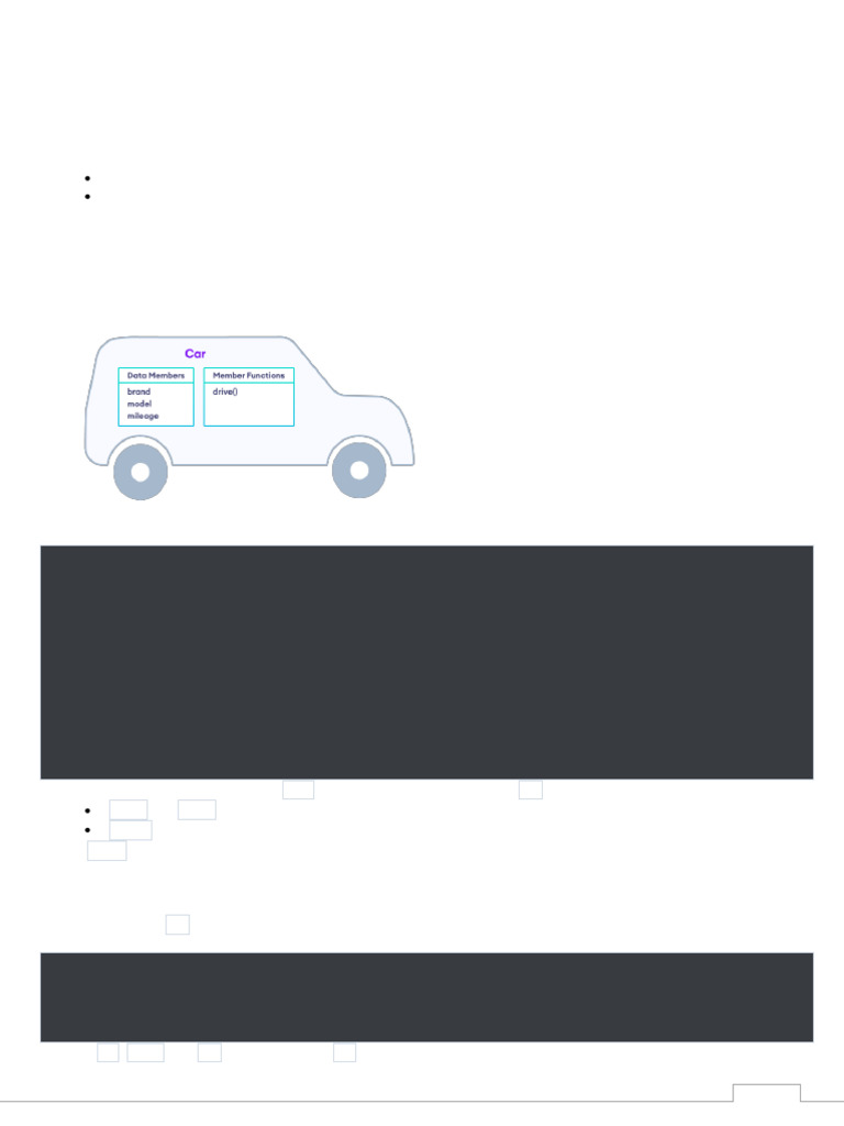 For example, the Car class defines the model, brand, and mileage. Now, based on the definition, we can create objects