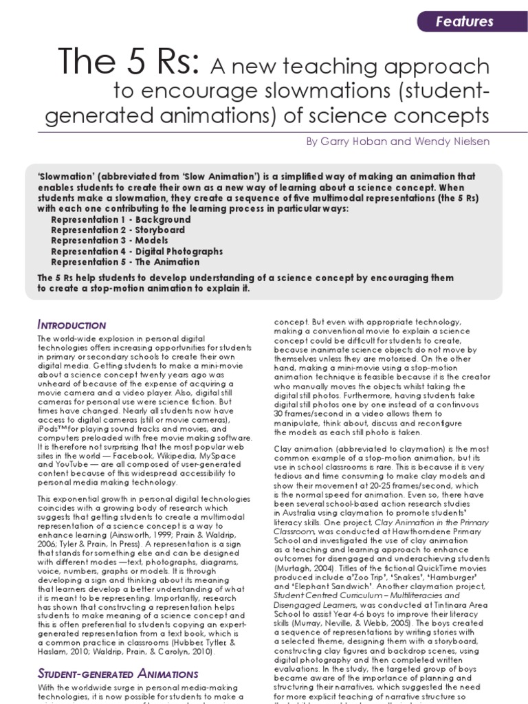 Getting students to create an animation of a science concept has traditionally been too difficult to achieve in school classrooms either due to lack of equipment or the complexity of the process. Moreover, when an animation has been created by students, such as with claymation, it has usually been for the teaching of literacy or art, not for the teaching of science. Even so, using claymation in a classroom is often too tedious and time consuming to be commonly used as a teaching approach. Slowmation greatly simplifies the process of creating animations and so makes the use of animation as a teaching approach more feasible. Additionally, it is an approach that involves students thinking about content in multiple ways and incorporates many connected learning processes. The 5 Rs is a new teaching approach to guide primary or secondary students so that they can create an animation as a representation of their learning in several hours. It is best to teach students the creation process in a small way using only twenty photos, which can be done in about two hours, and then they are able to make their own slowmation to explain a concept. Furthermore, because the technology is easily accessible and familiar a digital still camera, a tripod and free movie making software students can design and construct the animation in a classroom and finish it at home, or better still, make one at home and bring it to school to show the class. The key point of this article is that creating a slowmation helps students learn about a science concept because they are constructing a sequence of five multimodal representations, which encourages them to think about a science concept in multiple ways. Furthermore, asking the students to create an animation that explains a science concept engages them in learning about the concept because they need to understand it before they can explain it. Importantly, each representation can involve the use of different modalities notes, digital images, sketches, models and voice, which should complement each other and so the process incorporates multiliteracies that are commonly used in the scientific community. Although this article explains slowmation and gives one example of using the 5 Rs in a primary school classroom, there have been many other examples in schools and in other subject areas besides science. Undertaking a Google search on the word slowmation provides many different examples of animations made by students in schools in Australia, the USA and Canada.