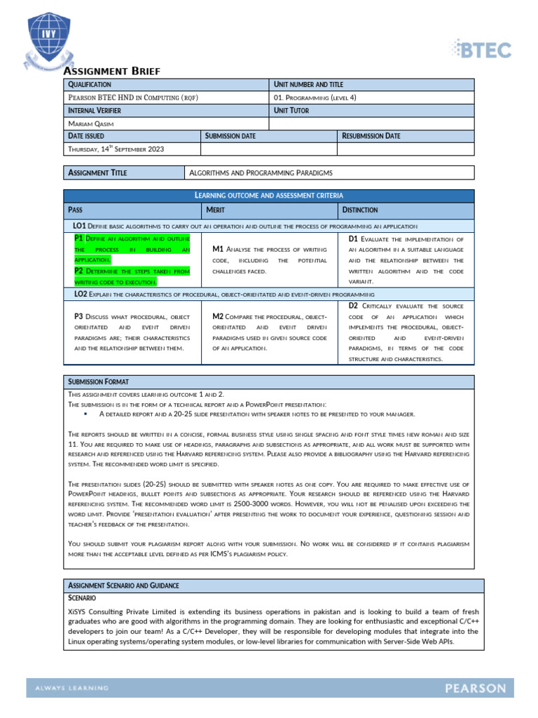 P1 DEFINE AN ALGORITHM AND OUTLINE D1 EVALUATE THE IMPLEMENTATION OF