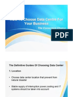 from major ISPs in your country like in Singapore, it is Singtel. Some major networks are covered at : http://www.geog.ucl.ac.uk/casa/mart s/isp_maps.html . When selecting multiple ISPs you must select ISPs using different backbones so you have connectivity atleast one provider when a backbone goes down. 6. Power Delivery/ UPS Continious power supply is the most important requirement along with connectivity to have 0% outages for the servers. Multiple power backups are preferred. Depending on the number of server you will accomodate you need to place the power backup infrastructure. A combination of battery backups plus heavy duty diesel generators is generally preferred in most leading datacenters of the world. The idea is to maintain power supply through battery backups till generators become operational in times of power grid failures. If you can build a backup infrastructure to give you about 24 hours of backup it is more than sufficient for normal power outages. 7. Airconditioning / Fire Control Equipment /Security . Servers are bound to get heated due to their continious working. A temperature controlled environment is very essential for proper functioning of the servers. When calculating power backup capcity you must consider airconditioning use as well. The temperature of the server rooms need to be maintained at 20-22 degrees celcius at all times. With the thousands/millions of wires connecting the servers to the power sources and connectivity sources, they are prone to some short-circuits which at times can cause fire. Fire control equipment needs to be installed in every room with automated triggering functions to prevent any damage. There are various types of fire control equipments available to opt from. Equipments which will not cause direct harm to server hardware should be selected. Use of liquid extinguishers should be avoided. Mist entinguishers can be used at the most. You also need to have security equipments in place to protect any critical or confidential data that the servers might be handling. Secure entry, logging of each visitor, limited staff access to actual server rooms, video camera monitoring are some things you need to implement for security. 8. Hardware / Internal Network With the amount of investment being put in it is necessary to have reliable and robust hardware for best performance of the server. We will discuss about the server hardware itself in a seperate topic. Apart from servers hardwares like cables, routers, switches, racks etc. are also needed. You need to form a rigid internal network structure which should include backups for each active network when designing your internal network. We will discuss the contructions of the internal network and the exact applications of each hardware in the Actual Setup of a Datacenter article to follow. 9. StaffDatacenters operate 247 and so you need to have staff