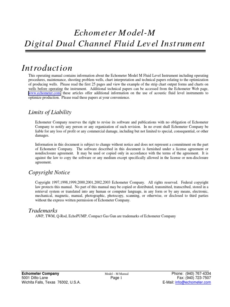 This operating manual contains information about the Echometer Model M Fluid Level Instrument including operating procedures, maintenance, shooting problem wells, chart interpretation and technical papers relating to the optimization of producing wells. Please read the first 25 pages and view the example of the strip chart output forms and charts on wells before operating the instrument. Additional technical papers can be accessed from the Echometer Web page, www.echometer.com, these articles offer additional information on the use of acoustic fluid level instruments to optimize production. Please read these papers at your convenience.