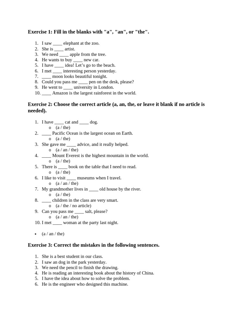Exercise 2: Choose the correct article (a, an, the, or leave it blank if no article is