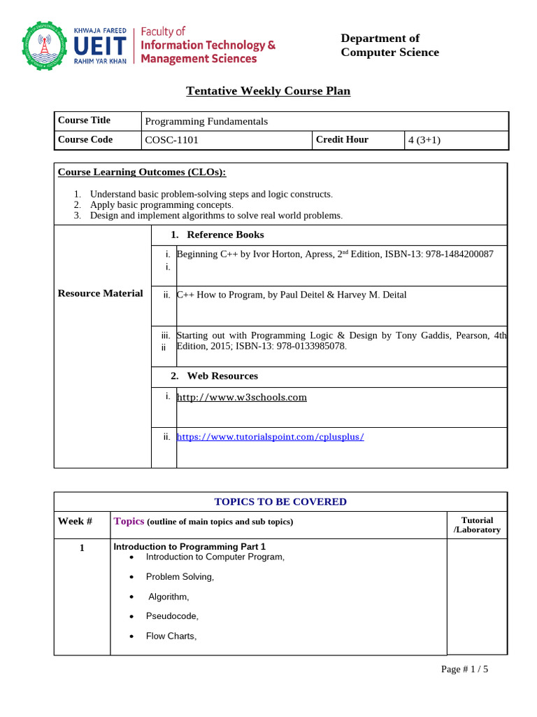 Course Code COSC-1101 Credit Hour 4 (3+1)