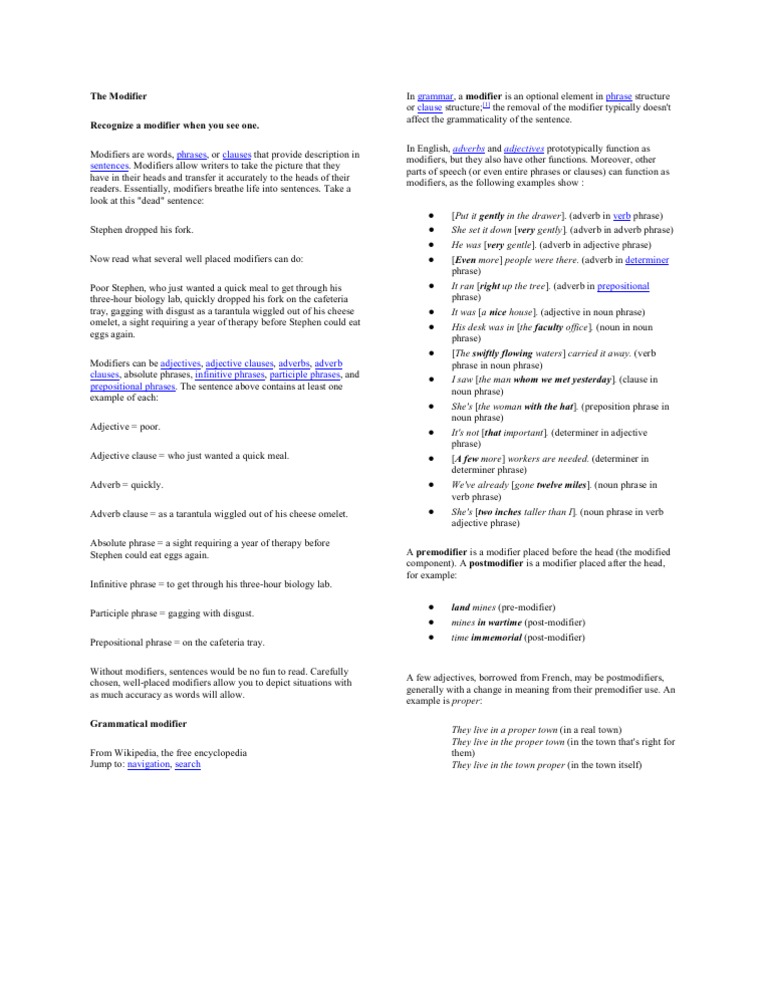 Modifiers are words, phrases, or clauses that provide description in sentences. Modifiers allow writers to take the picture that they have in their heads and transfer it accurately to the heads of their readers. Essentially, modifiers breathe life into sentences. Take a look at this "dead" sentence: Stephen dropped his fork. Now read what several well placed modifiers can do: Poor Stephen, who just wanted a quick meal to get through his three-hour biology lab, quickly dropped his fork on the cafeteria tray, gagging with disgust as a tarantula wiggled out of his cheese omelet, a sight requiring a year of therapy before Stephen could eat eggs again. Modifiers can be adjectives, adjective clauses, adverbs, adverb clauses, absolute phrases, infinitive phrases, participle phrases, and prepositional phrases. The sentence above contains at least one example of each: Adjective = poor. Adjective clause = who just wanted a quick meal. Adverb = quickly. Adverb clause = as a tarantula wiggled out of his cheese omelet. Absolute phrase = a sight requiring a year of therapy before Stephen could eat eggs again. Infinitive phrase = to get through his three-hour biology lab. Participle phrase = gagging with disgust. Prepositional phrase = on the cafeteria tray. Without modifiers, sentences would be no fun to read. Carefully chosen, well-placed modifiers allow you to depict situations with as much accuracy as words will allow. Grammatical modifier From Wikipedia, the free encyclopedia Jump to: navigation, search