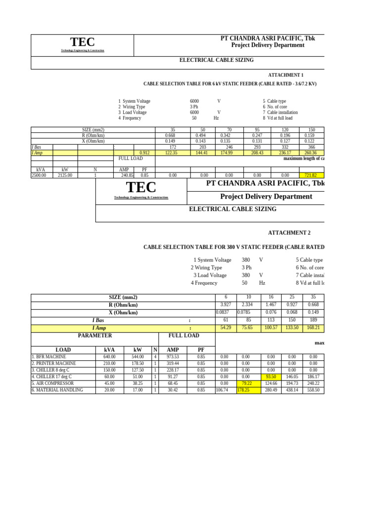 CABLE SELECTION TABLE FOR 6 kV STATIC FEEDER (CABLE RATED - 3.6/7.2 KV)