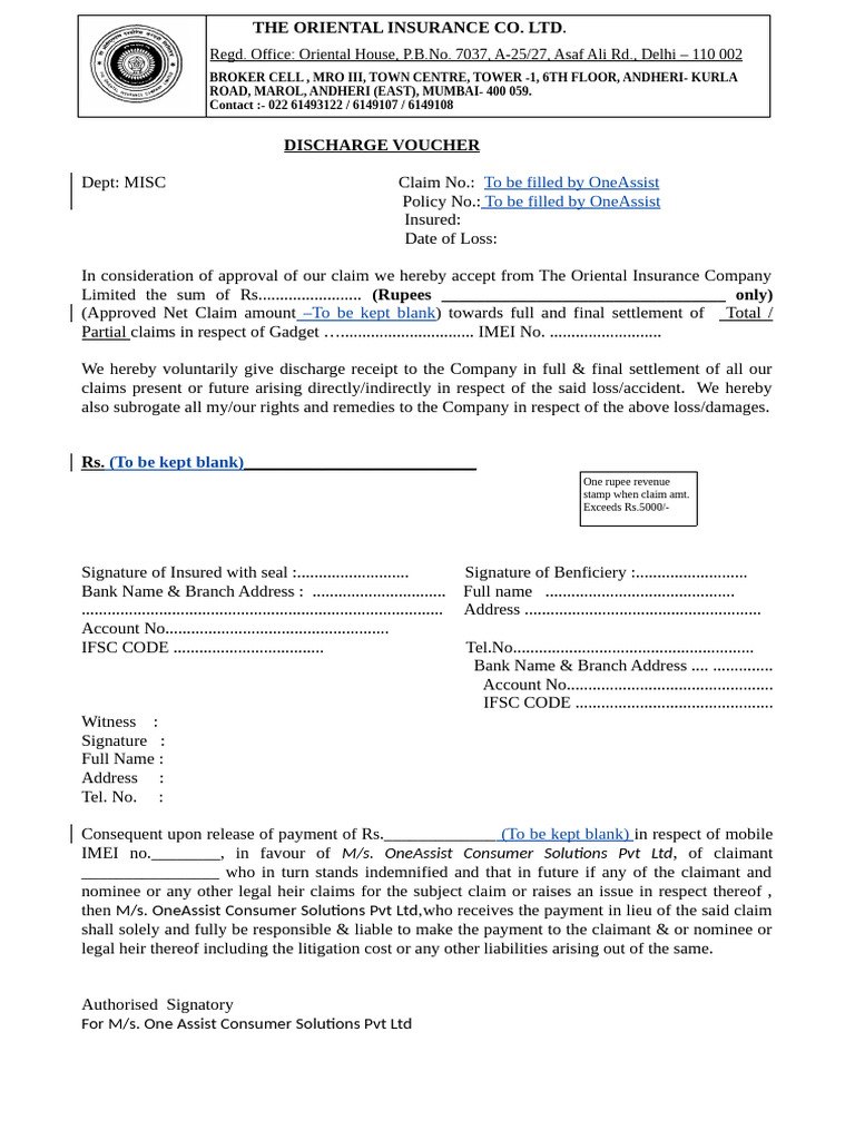 Dept: MISC Claim No.: To be filled by OneAssist