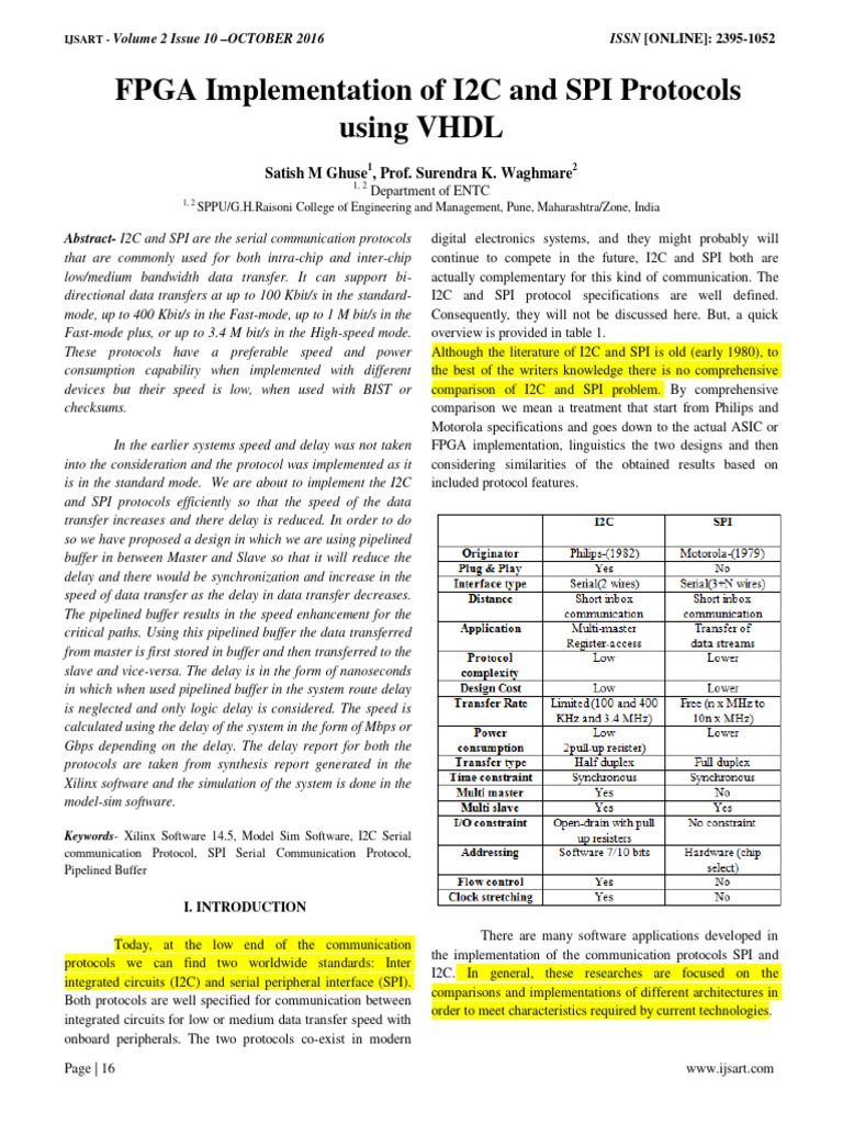Abstract- I2C and SPI are the serial communication protocols digital electronics systems, and they might probably will