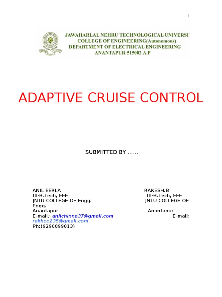 Every minute, on average, at least one person dies in a crash .We have achieved significant progress in the driver assistance systems through the introduction of the features such as brake assist, electronic stability, 2. Adaptive cruise control 3. Collision Avoidance 4. Design of acc 5. Features of acc. 6. Road eye radar. 7. Key benefits of acc. 8. Future prospects of acc 9. Conclusion. acceleration skid control and a lane departure warning system. But the ultimate solution is to avoid the cars from smashing into each other in the first place. Adaptive Cruise Control {ACC) is an expansion of existing cruise control systems, which in general maintain the vehicle speed through a link in the vehicle power train. With the help of this ACC, we can automatically maintain a set head way distance to a preceding vehicle. It prevents the car from colliding with others on the express way. This paper discusses about the design, features, benefits and future prospects of acc. 1. Introduction INDEX