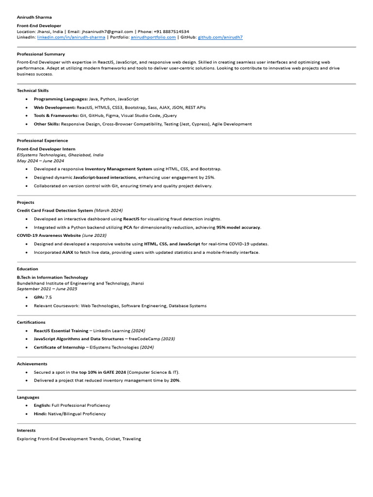 Location: Jhansi, India | Email: jhsanirudh7@gmail.com | Phone: +91 8887514534