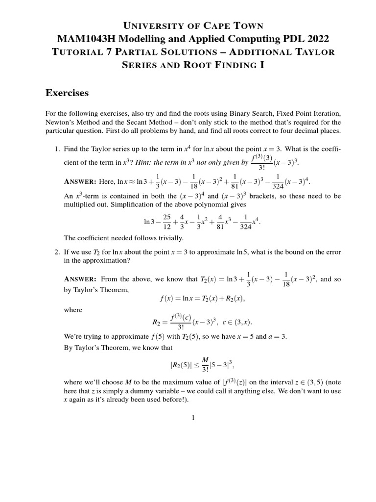 T UTORIAL 7 PARTIAL S OLUTIONS – A DDITIONAL TAYLOR