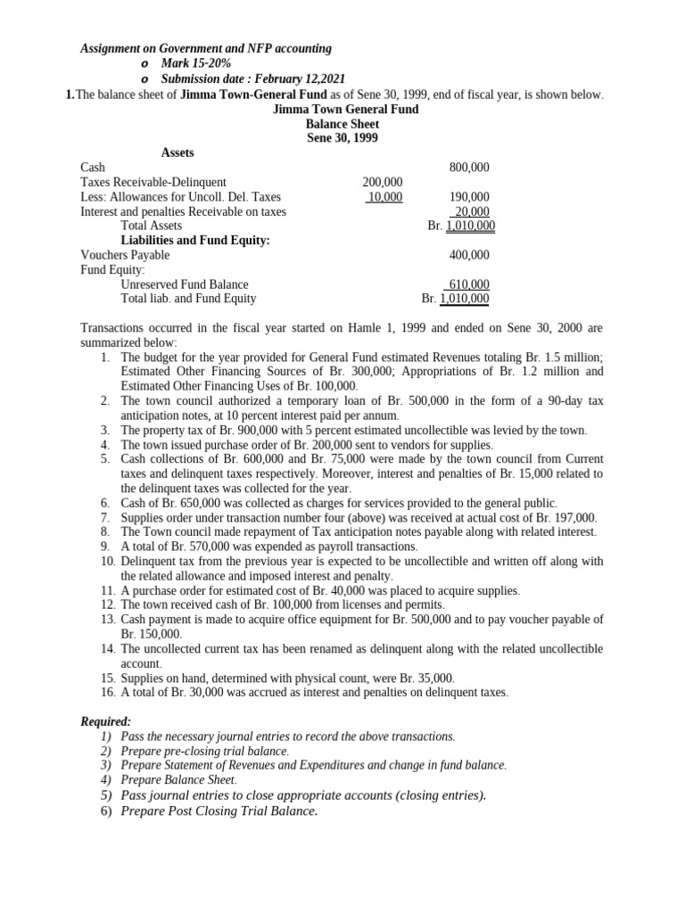 1.The balance sheet of Jimma Town-General Fund as of Sene 30, 1999, end of fiscal year, is shown below.