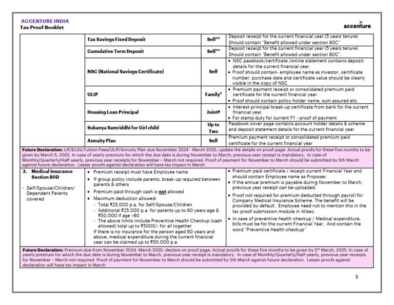 Future Declaration: LIP/ELSS/Tuition Fees/ULIP/Annuity Plan due November 2024 - March 2025; update the details on proof page. Actual proofs for these five months to be