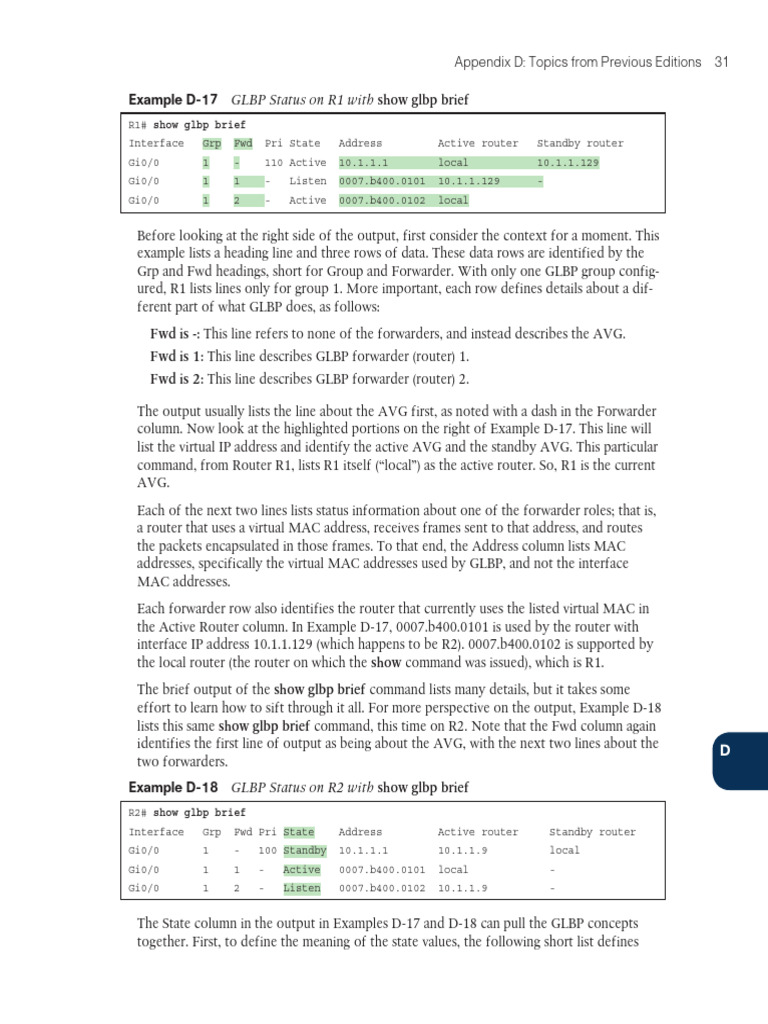 The State column in the output in Examples D-17 and D-18 can pull the GLBP concepts