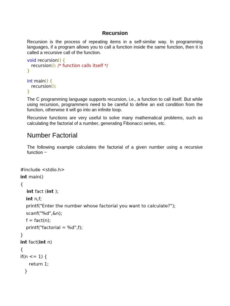 The following example calculates the factorial of a given number using a recursive