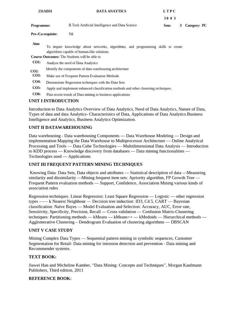 Programme: B.Tech Artificial Intelligence and Data Science Sem: 3 Category: PC