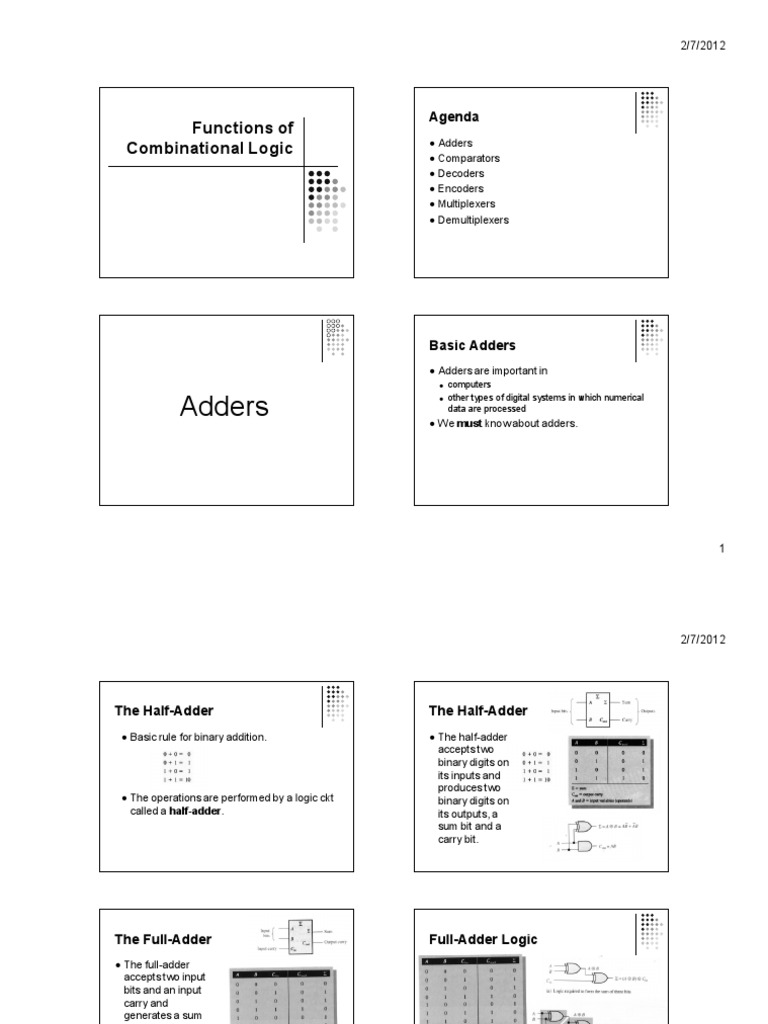 Adders Comparators Decoders Encoders Multiplexers Demultiplexers