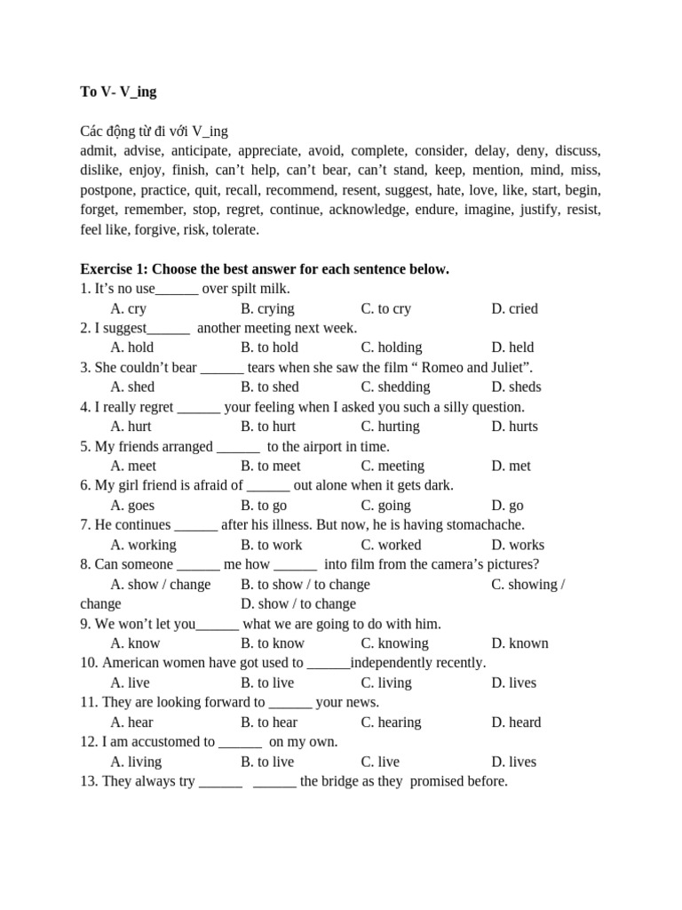 dislike, enjoy, finish, can’t help, can’t bear, can’t stand, keep, mention, mind, miss,
