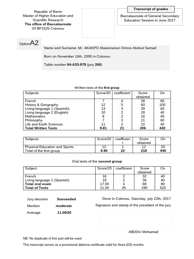 This transcript serves as a provisional diploma certificate valid for three (03) months.