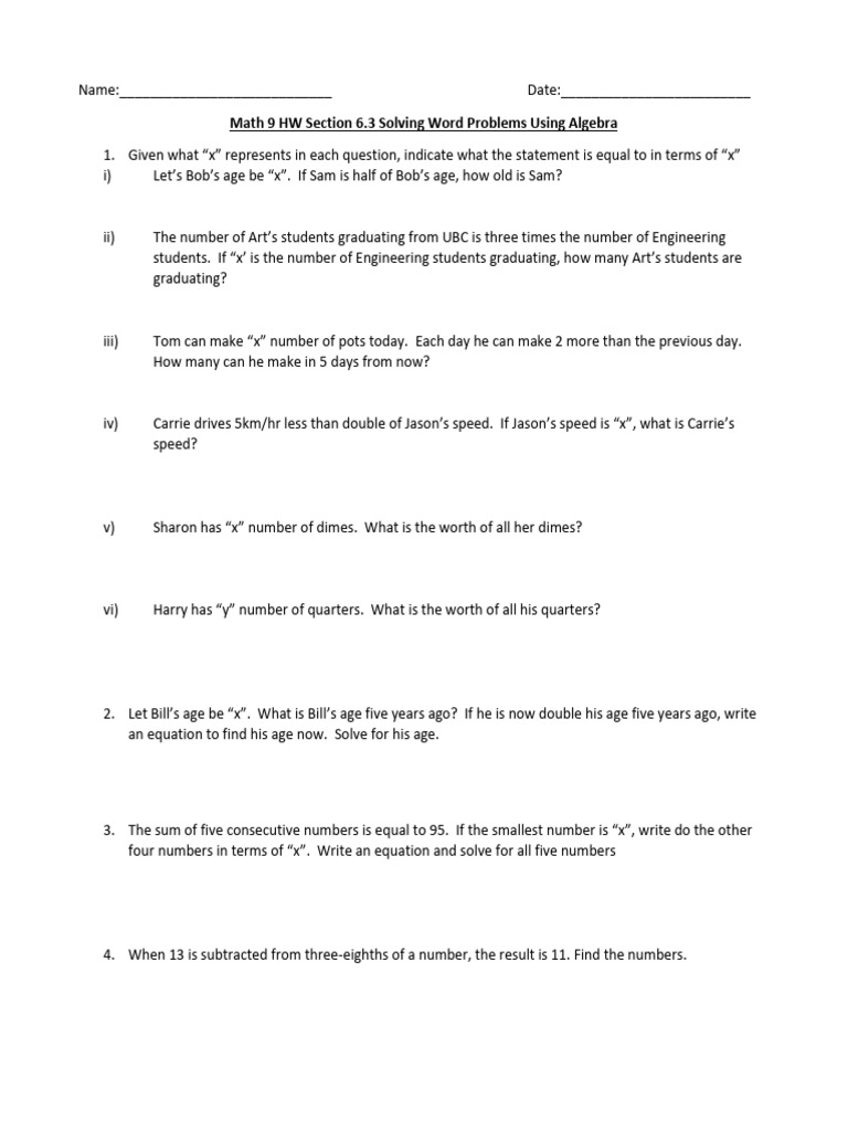 Math 9 HW Section 6.3 Solving Word Problems Using Algebra